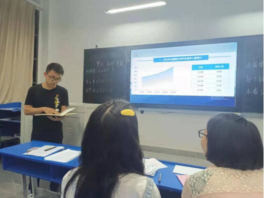 邱卫东主要从考研趋势分析、分数构成概况、院校和专业选择、备考四个方面做分享。首先,邱卫东列出了近几年考研人数、学硕报考人数和专硕报考人数成,做考研趋势分析,同时在巨大的就业压力之下,考研成为了大势所趋,旨在激发考研动机。讲分数构成概况使得同学们了解到考研是怎么一回事。讲院校和专业选择时,强调了信息搜集的重要性,提醒同学们不要盲目选择。最后介绍了政治、英语和专业课复习时所用的参考资料和方法,为正在备课的2018级提供了参考。所做分享内容照顾到了不打算考研、正打算考研和不知道如何备课三个层次的同学,覆盖了考研的全过程。
