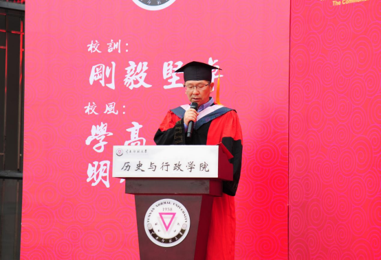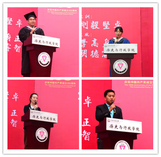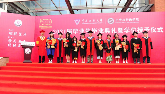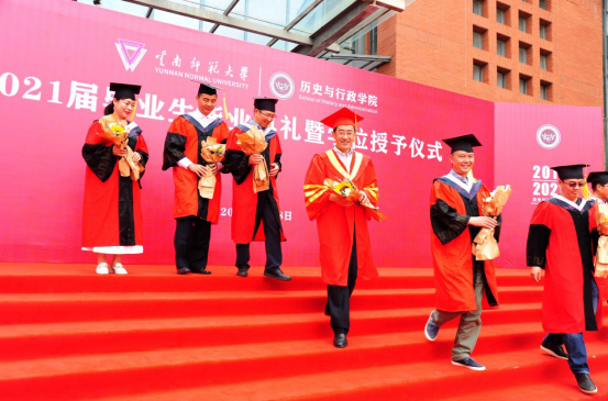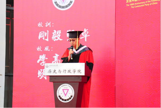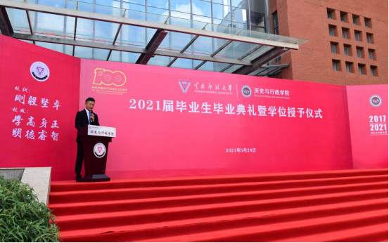 随后,公司本科优秀毕业生代表2017级文物与博物馆学专业梁英旭同学和硕士优秀毕业生代表2018李铭同学依次上台发言,他们对母校及朝夕相处的老师同学们致以了最诚挚的感谢,并表达对未来的遥望与期许,中兴业,需人杰,每一位青年学子都应当做到有猷 、有为、有守,不断在人生道路上砥砺前行。在校生代表2018级历史学专业朱芮同学致欢送辞,她说,毕业是结束,更是新的开始,她祝福学长学姐们前程似锦,归来仍是少年。教师代表周鹏老师发言,他以诙谐幽默的语言回顾了2021届毕业生经历的种种难忘往事,并指出,老员工涯是人生最美好的时光之一,在今后的学习生活中,他希望大家自强不息,弘扬和传承西南联大精神,厚德载物,汲取和涵养书中智慧养分。