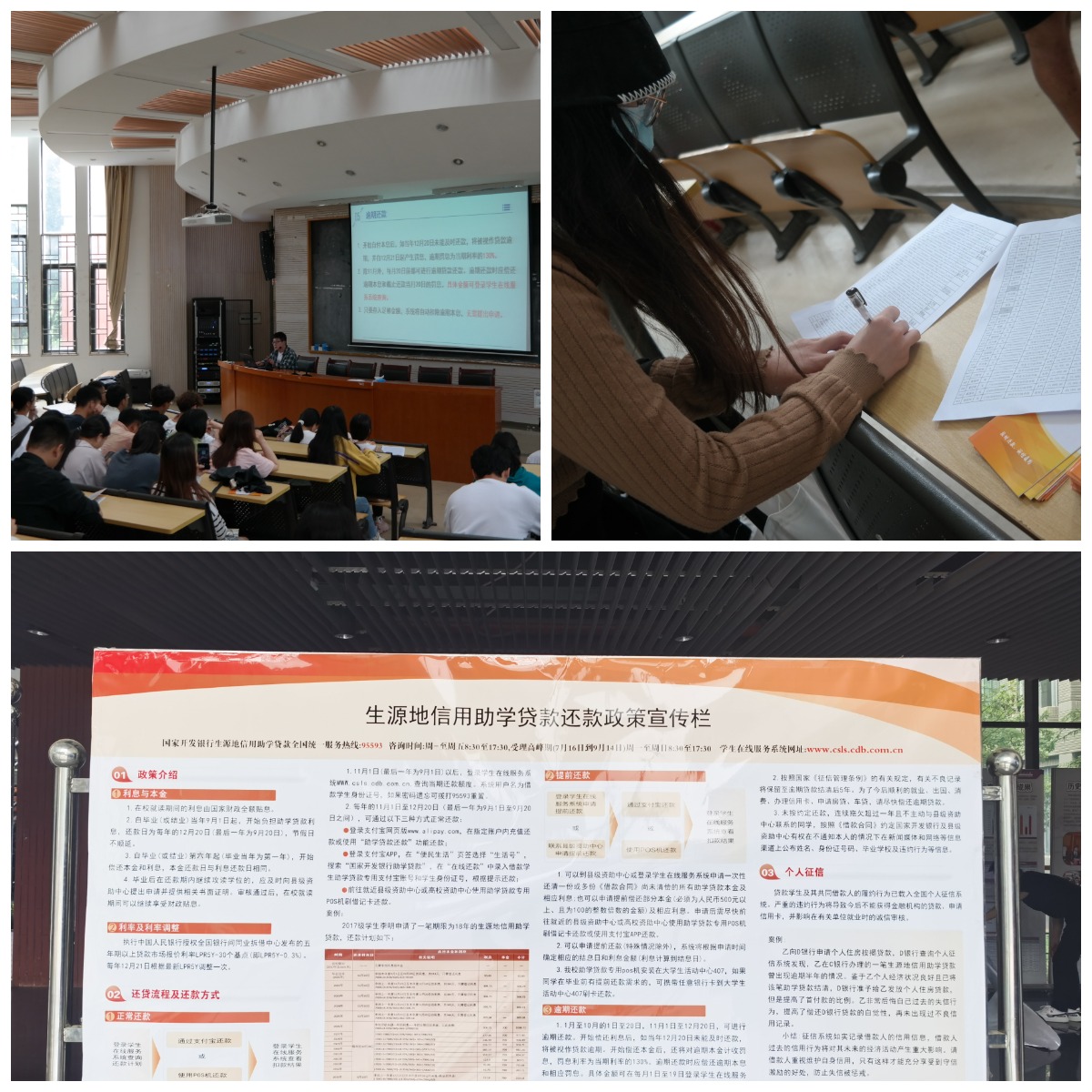 延老师分别从助学贷款毕业确认、信贷政策、还款流程、系统操作方式、常见问题解答等五个方面进行了详细讲解,并且通过案例生动说明了老员工按时还贷的重要性。延老师强调,同学们在享受国家助学贷款政策的同时,应勤俭节约,刻苦学习,恪守诚信美德,严守贷款合同;毕业后努力工作,合理安排收入,按时归还本息,做一个诚实守信、对社会有用的人。