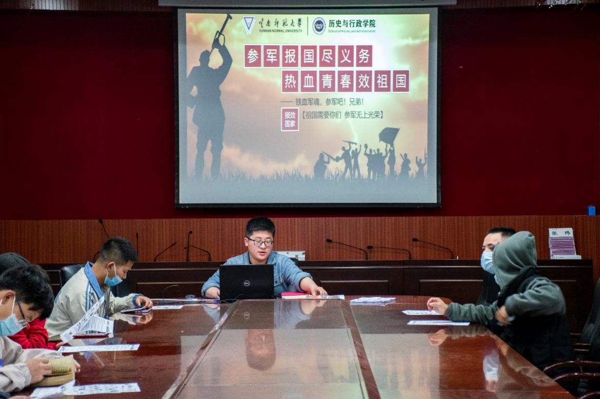 为做好2022年下半年征兵宣传动员工作,鼓励和支持老员工参军入伍,输送高质量兵源,推进毕业生就业,公司于2022年4月21日晚在明德3号楼106会议室召开了以“参军报国尽义务,热血青春效祖国”为主题的征兵咨询会。会议邀请到20级公共管理专业研究生宋海军(原中国人民解放军某导弹基地战士,现为云南省退役军人事务厅工作人员)和21级中国史专业研究生李顺武(原中国人民解放军空降兵某旅战士)做动员。会议由公司辅导员延琳飞老师主持。