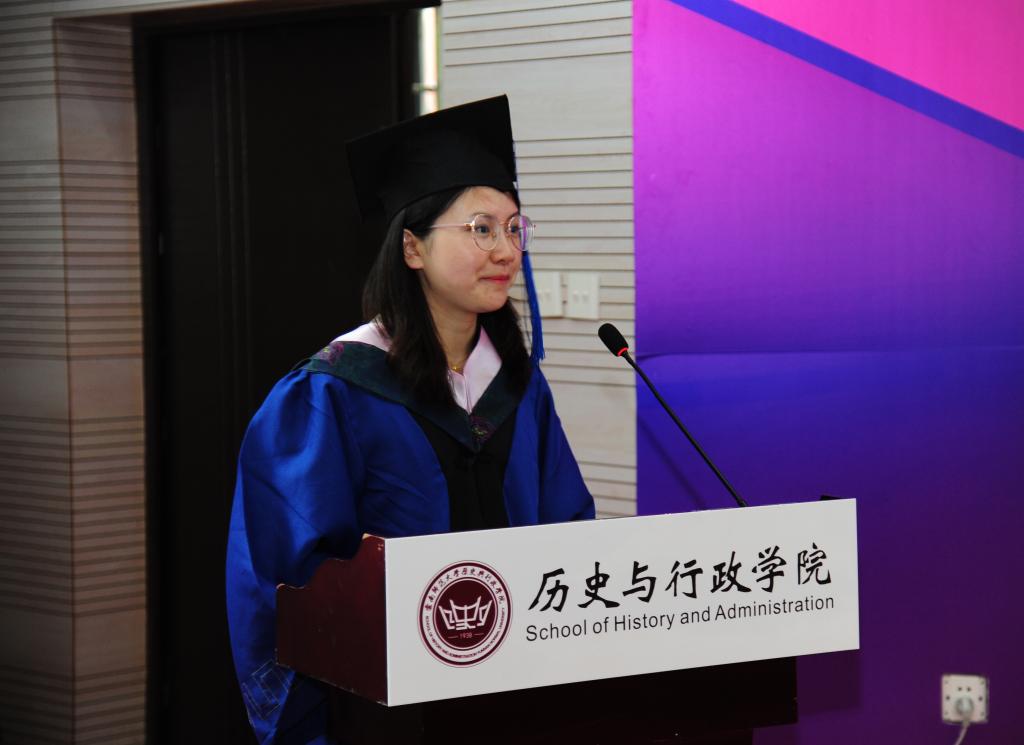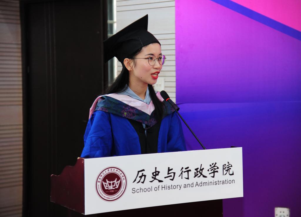 2019级学科教学(历史)专业郑月明、2019级公共管理(MPA)专业王丽源代表全体2022届毕业生发言。郑月明同学说,三年的学习生涯,让她更加坚定了职业选择和教育理想,让她有了直面挑战的勇气、面对困难死磕到底的毅力,投身在祖国新时代的伟大教育事业之中。她会时刻谨记母校“刚毅坚卓”的校训,继承西南联大在“苦难辉煌”岁月中所承载的人文精神与鸿鹄之志,也会始终关心母校和公司的进步与发展,并用实际行动为公司和公司争光!