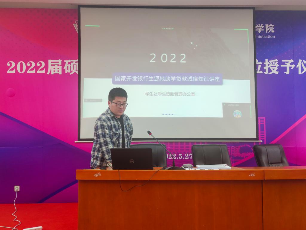 第四项议程,辅导员延琳飞老师开展了贷款毕业生诚信还款教育,宣讲了国家开发银行生源地助学贷款贷相关政策,明确了毕业生借款还款义务,希望毕业生诚信还款,保持良好的个人征信记录,弘扬诚信的社会主义核心价值观。