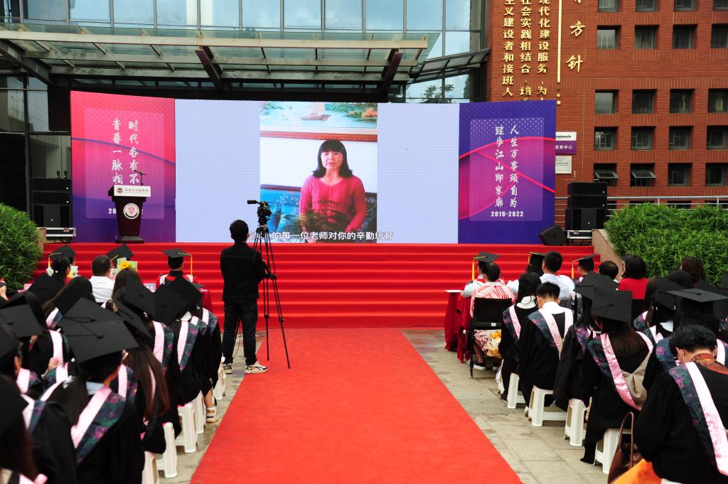 接下来,典礼进入了“彩蛋”环节。“你若盛开,蝴蝶自来,做最好的自己;你若精彩,天自安排,付出才有收获;你若不离不弃,我必相伴相依,永怀感恩之心;你若安好,便是晴天,祝福未来可期。”受疫情影响,不能亲临现场分享毕业生荣耀的父母们通过视频的方式送上了最诚挚的祝福。这是特意送给同学们的惊喜。典礼前,公司“悄悄”联系了部分毕业生的家长,邀请他们为员工录制祝福视频,并全程保密。家长们或操着方言、或盛装出镜,他们的祝福真挚而热烈,朴素却感人。当现场被“蒙在鼓里”的毕业生们看到大大屏幕上的父母时,瞬间破防。