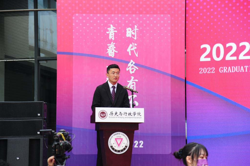 教师代表方天建用其标志性的“大嗓门”娓娓道来与同学们四年的《缘分》。“缘分,来自于你们不曾想到,我也不曾预设,但恰恰是你们怀揣着青春的美好,步入大学,我携着而立之年的事业愿景,走上岗位的那一刻。我们相遇了,相逢了,相识了,从而开始了一场大学新生与大学新人之间的斗智斗勇之旅。”他的发言幽默诙谐,现场笑声不断。