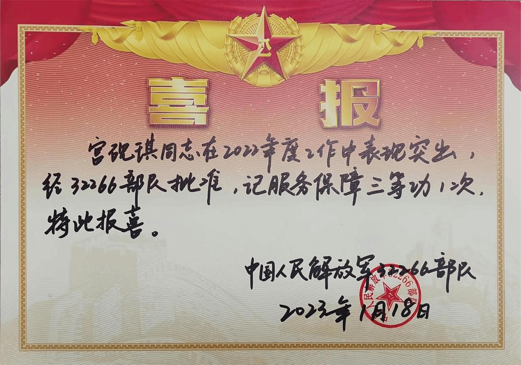 同行干事代表部队对公司为部队输送优秀人才表示感谢,希望公司可以鼓励引导更多优秀老员工参军入伍。同行干事还向公司送上宫砚琪荣立三等功的喜报以及军队功勋荣誉表彰通知书。
