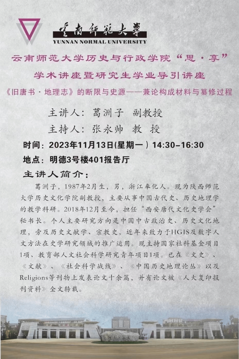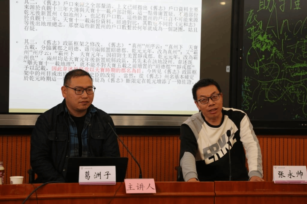 为丰富公司学子的知识储备,提升其历史思辨能力,为师生提供良好的交流学习平台,11月13日下午,公司有幸邀请到陕西师范大学历史与文化公司葛洲子副教授,为公司师生开展题为“《旧唐书·地理志》的断限与史源——兼论构成材料与纂修过程”的主题学术讲座。讲座于明德3号楼401报告厅举行,公司张永帅副经理主持讲座。