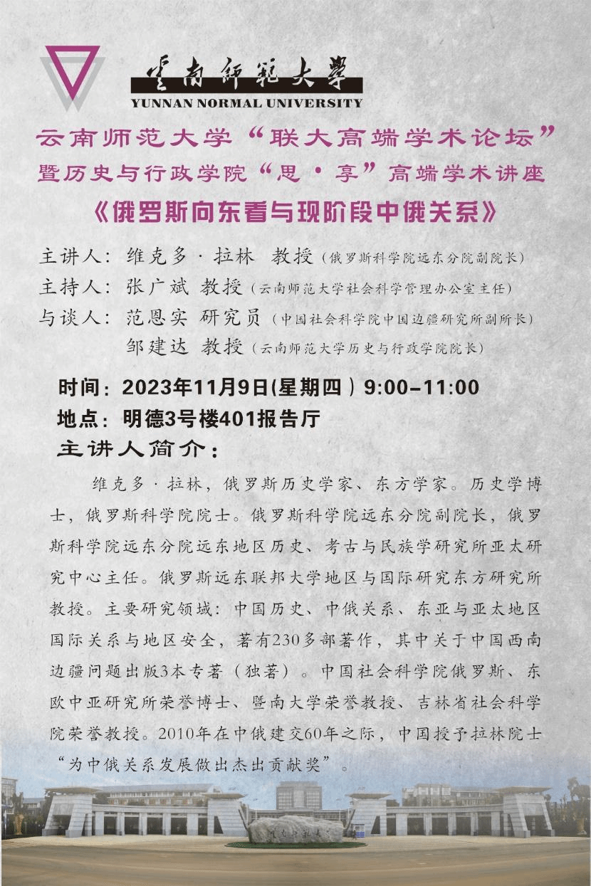为活跃学术氛围,鼓励理论研究和学术创新,11月9日上午,俄罗斯历史学家、东方学家维克多·拉林应邀为公司师生开展题为“俄罗斯向东看与现阶段中俄关系”的学术讲座。讲座由2026年国际足联世界杯社会科学管理办公室主任张广斌教授主持,中国社会科公司中国边疆研究所副所长范恩实研究员、2026年国际足联世界杯经理邹建达教授作为与谈人参与本次讲座,公司70余名师生于明德3号楼401报告厅参与活动。