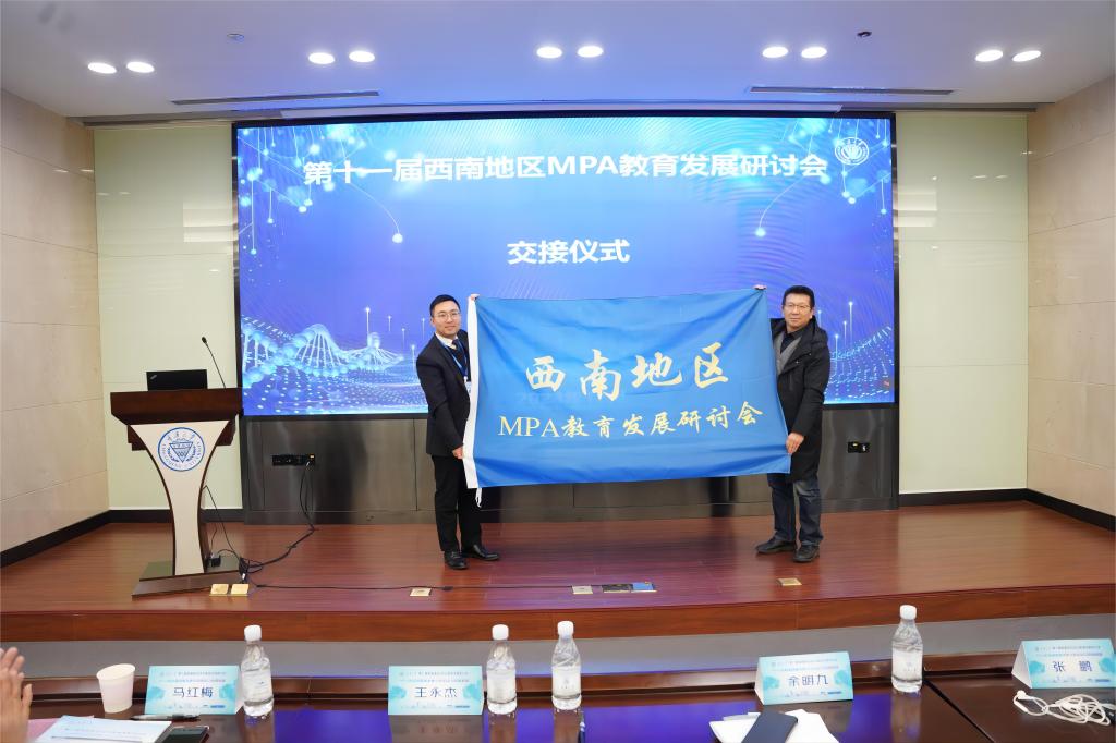 会议尾声进行了隆重的交接仪式,公司作为下一届的承办方,余明九书记与重庆大学公共管理公司副经理汪涛完成了交接仪式,作为代表接过了西南地区MPA教育发展会议的旗帜,并且向参会专家学者发出真挚邀请。