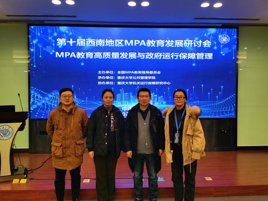 为促进MPA教育高质量发展,持续深入推进MPA教学改革,深化西南地区各MPA培养单位之间的交流与合作,12月23日,“第十届西南地区MPA教育发展研讨会”在重庆大学主教学楼5楼会议室举办。公司党委书记余明九、综合办公室主任段雁、学工办主任金晓芳、MPA教育中心教学秘书王浩参加了此届研讨会。
