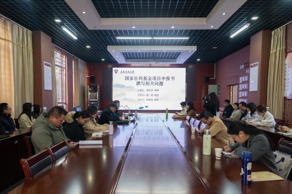 张教授从选题依据、写作格式等方面进行了详细阐述。在选题依据方面,他强调了国内外相关研究的学术史梳理及研究动态的重要性,特别是在已有国家社科基金项目的基础上如何提出新的研究问题。此外,他还从学术思想、学术观点和研究方法等角度,深入分析了如何提升申报书的质量。为了使与会者更好地理解撰写技巧,张教授结合近年成功立项的申报案例,逐条分析了其中的成功经验与不足之处。在交流环节,与会师生踊跃提问,围绕申报书撰写中的实际困惑踊跃提问,张教授一一耐心解答,并结合自身科研经验提供针对性建议。